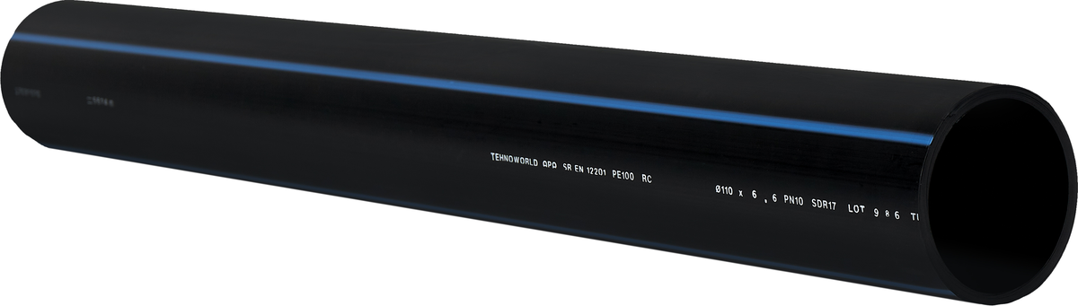 HDPE pipes PE 100 RC, single-wall and double-wall, black with 4 co-extruded brown lines or entirely blue for water distribution and transport, manufactured according to EN12201-2, ISO 4427. The pipes are produced respecting the requirements of ISO 9001:2008, ISO 14001:2004 and Product Compliance Certificate issued by Bureau Veritas (BVQI) No. 672/002, third party certification body accredited according to norm UNI CEI EN 45011 and 45004. Diameters: 20 ÷ 1200 mm.