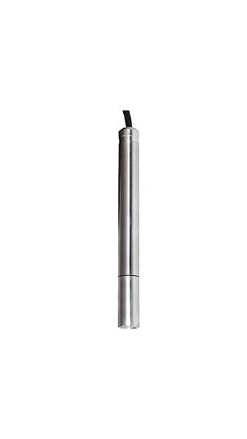 Medición de nivel de tuberías de pequeño diámetro, aguas residuales, soluciones salinas, agua de mar, agua potable Transmisor sumergible de 2 o 3 cables Sensor de cerámica capacitivo, de acero inoxidable y de cerámica piezoresistiva Cuerpo de acero inoxidable o totalmente de plástico. Error de linealidad: ±0,25% Sensor de temperatura Pt100 integrado