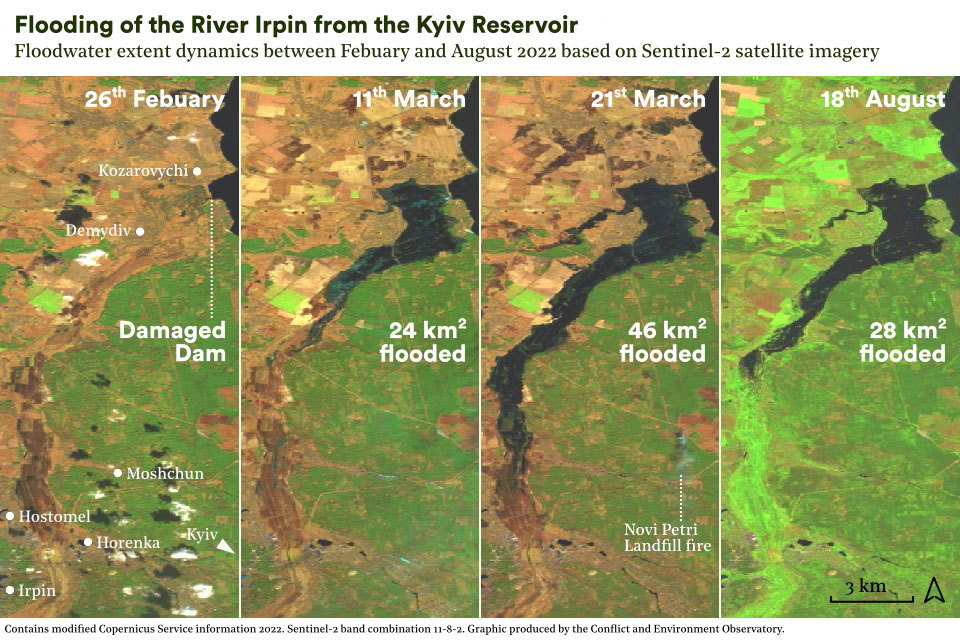This led to floodwater accumulating in the Irpin river valley, flooding the towns of Demydiv and Kozarovychi (as seen in the image below).