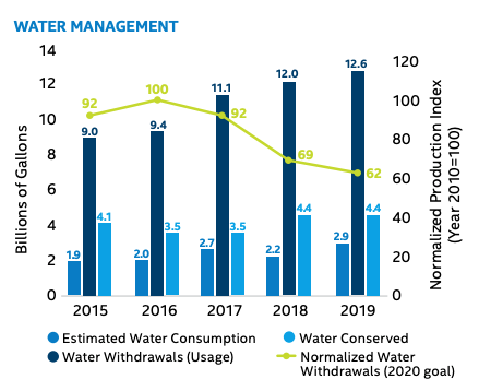 The company has linked a portion of the executive and employee compensation to corporate responsibility factors. Targets have been set to conserve more than five billion gallons of water in its operations and restore more than one billion gallons of water to local watersheds.