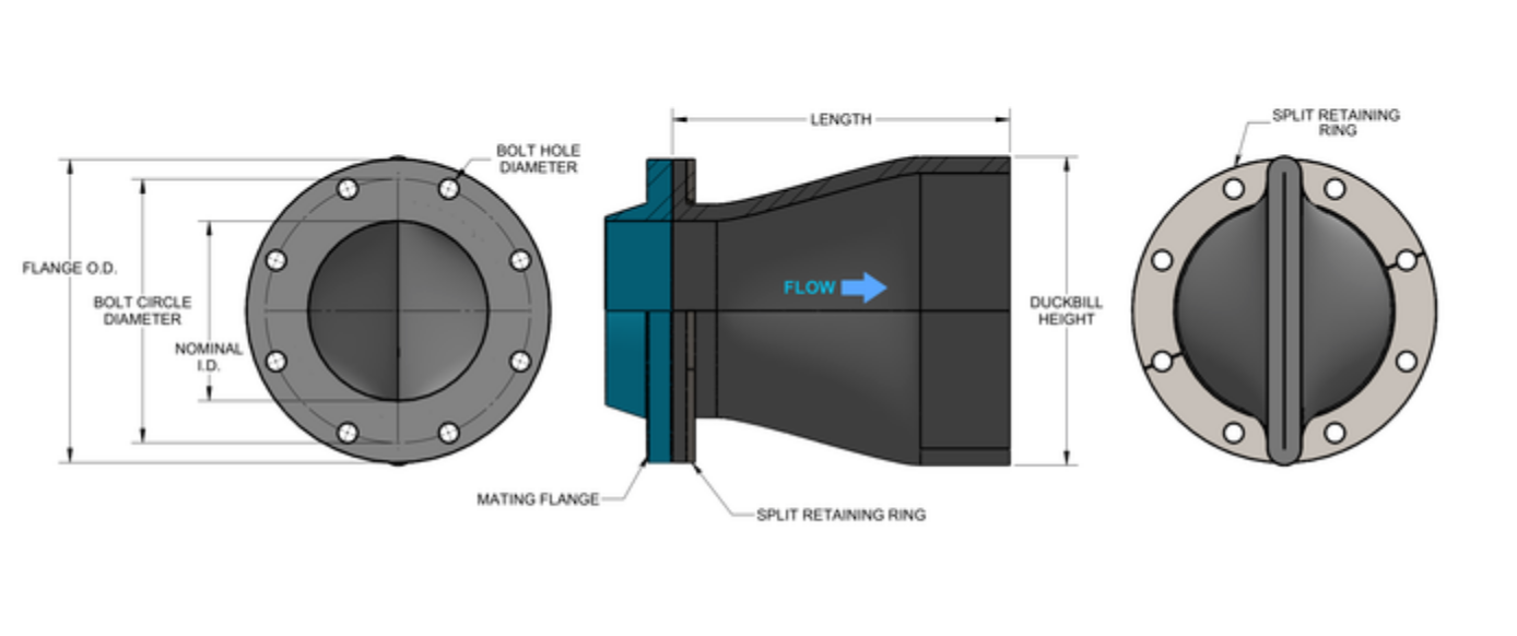 Duck bill check valves rely on a flexible rubber diaphragm which creates a valve that will remain closed unless positive pressure is applied.