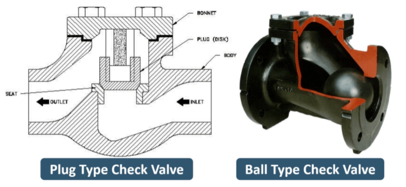 A ball type and plug type check valve work on the principle of gravity – when there is enough pressure in the flow the ball is lifted, then it drops the ball roll back to close the opening.
