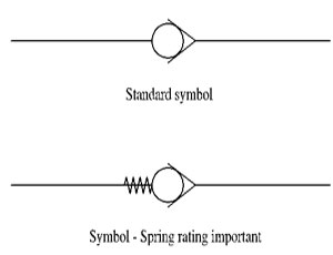 Below are two check valve symbols: the top one, flow is allowed from the bottom of the pipe but not the other way, the bottom, the valve will only allow flow when the pressure at the bottom is greater than the pressure at the top (taking into account the rating on the spring).